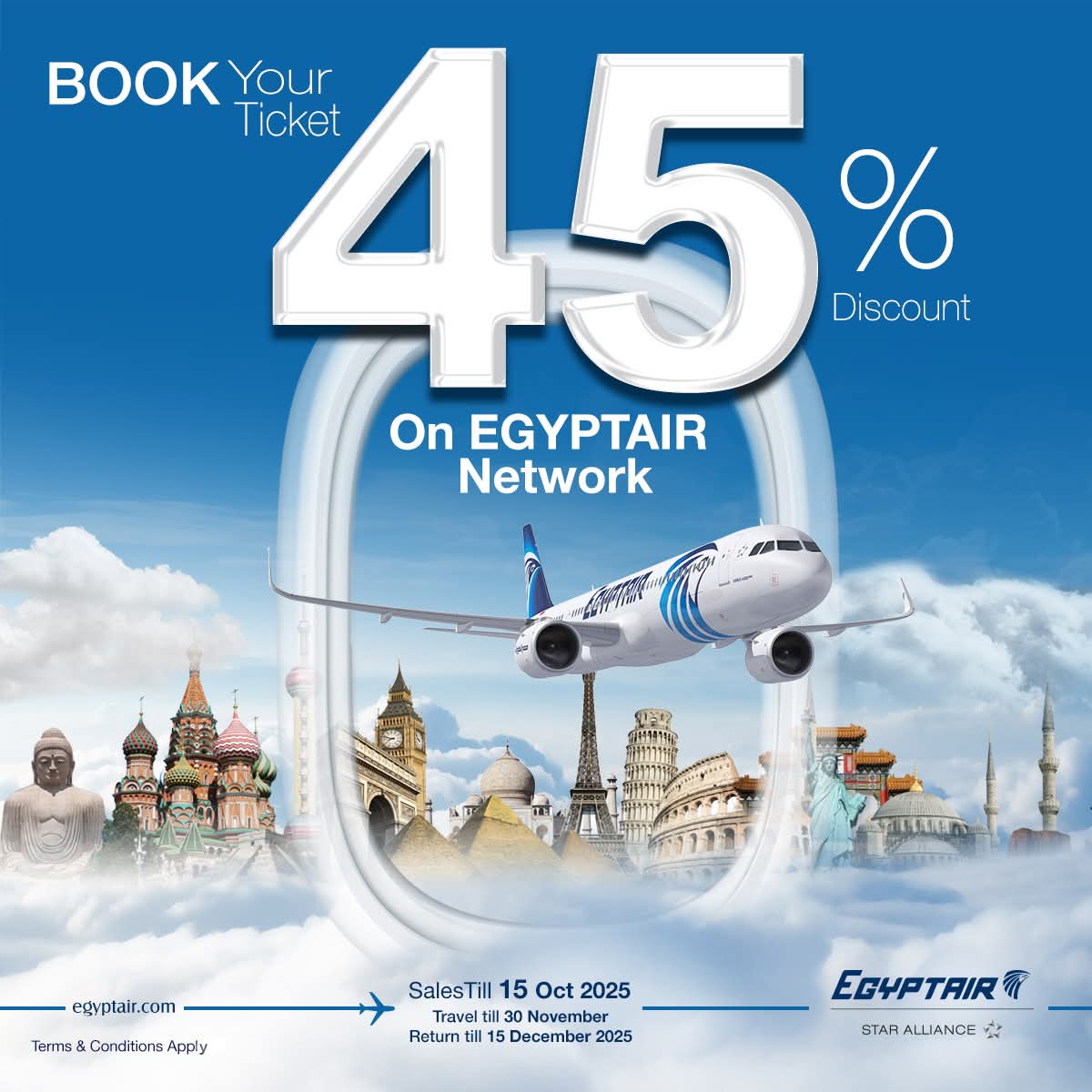 أعلنت شركة مصر للطيران عن إطلاق حملة تخفيضات كبرى تصل إلى ٤٥٪ على رحلاتها الدولية من وإلى القاهرة، وذلك وفقًا للدرجات السعرية المتاحة على الرحلات.